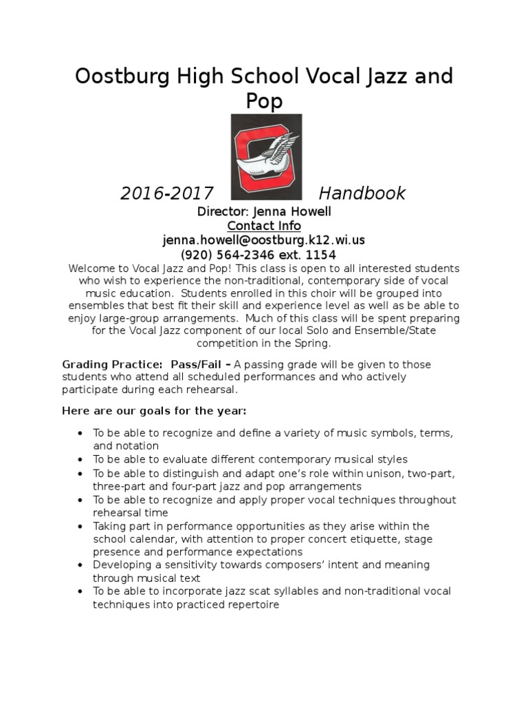 Oostburg High School Vocal Jazz and Pop Handbook PDF Choir Singing